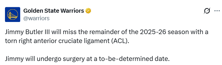 北京时间1月21日,勇士官方发布声明,前锋吉米-巴特勒因右膝前交叉韧带撕裂,将缺席2025-26赛季的剩余所有比赛。巴特勒是在昨日对阵迈阿密热火的比赛第三节还剩7分41秒时受伤的,勇士队最终以135-112获胜。他将在择期接受手术。在勇士官方宣布这一消息前,巴特勒已经更新社媒,晒出自己的PS“将军照”,配上了大量勇士比赛照,并写道:“44/82,我很快就会回...